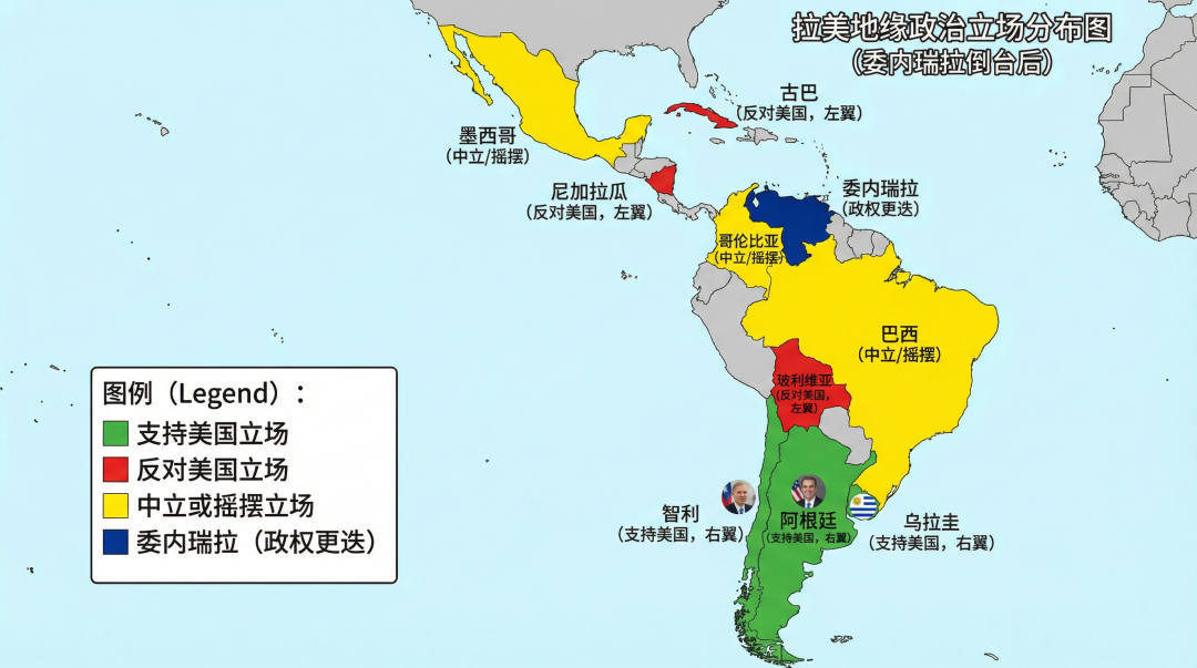 拉美地缘政治立场分布地图。绿色表示支持美国的国家(阿根廷、智利等右翼政权),红色表示反对美国(古巴、尼加拉瓜等左翼政权),黄色表示中立或摇摆(巴西、墨西哥、哥伦比亚)。委内瑞拉用深蓝色标注