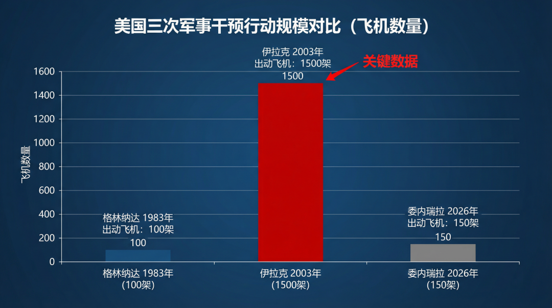 美国三次军事干预行动的飞机出动规模对比图。格林纳达1983年出动100架飞机,伊拉克2003年出动1500架飞机,委内瑞拉2026年出动150架飞机。