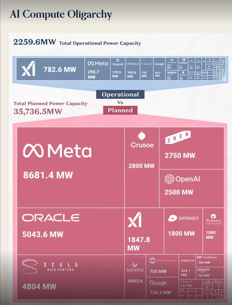 马斯克的xAI也是这个逻辑。他多次警告,目前AI最大的中长期瓶颈会从芯片,转向电力生产和电网,数据中心和AI集群会在未来几年吃掉极其可观的全球电力,对电网形成硬约束。再结合他疯狂堆GPU、建算力超级工厂/超级集群的行为,很难说他主观上相信再堆算力也没什么提升。