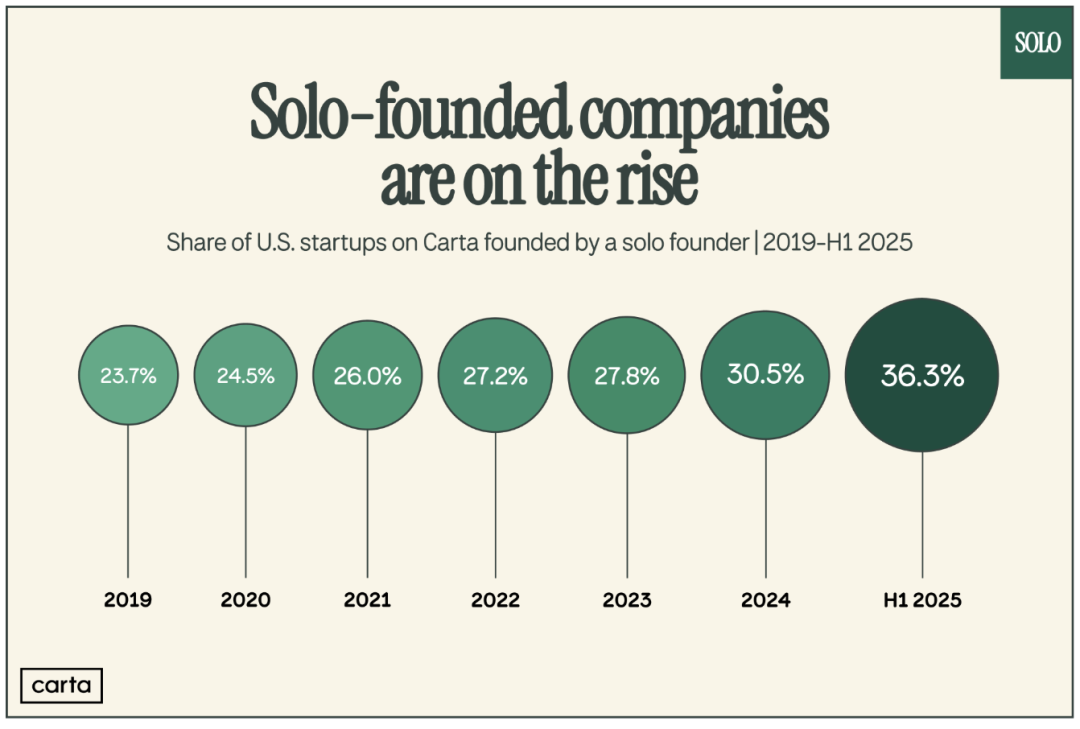 全球所有权管理平台独角兽Carta,前不久刚公布的一组创业数据:2025 年上半年,美国初创企业中单人创始公司比例已达36.3%,也就是超过三分之一,创下历史最高纪录,比2019年增长了一半以上,这是个非常惊人的变化。