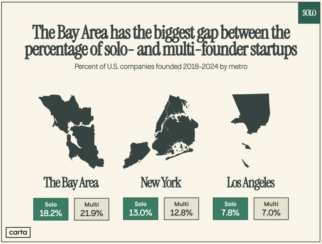 在美国,旧金山湾区、纽约、洛杉矶是三大创业中心,其中一人创业占比最高的还是旧金山湾区,但有意思的是,Solo Founders 首席执行官Julian Weisser评论道: