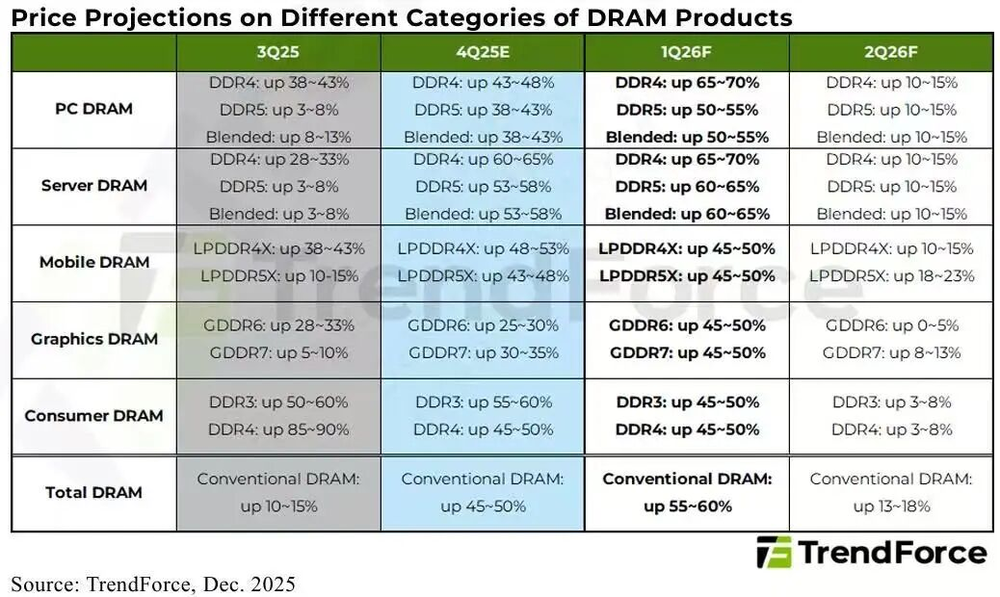 TrendForce最新公布的研究报告称,由于DRAM原厂大规模将先进制程、新产能转移至服务器、HBM应用,以满足AI服务器的需求,其余市场供给严重紧缩,预计2026年第一季度整体通用型DRAM合约价将环比增长55-60%。其中,面向移动应用的LPDD4X和LPDDR5X预计将涨价45-50%;面向PC的DDR4预计将涨价65-70%,DDR5预计将涨价50-55%;其他消费类DDR4/DDR5预计将涨价45-50%。