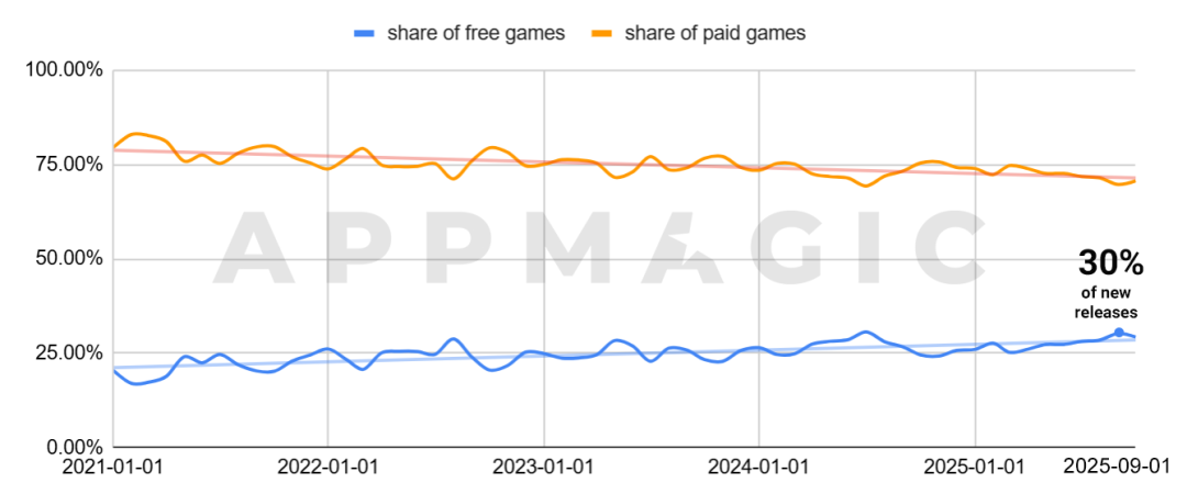 无论你选择给游戏标价,还是将其做成免费游玩,有一个现实是整个市场都无法回避的:免费游戏正在Steam上占据越来越大的空间,并逐步扩大其对所有价格区间定价策略的影响力。在2025年9月,免费游戏达到了历史新高——当月上线的新作中,约30%为免费游戏,数量约650款。