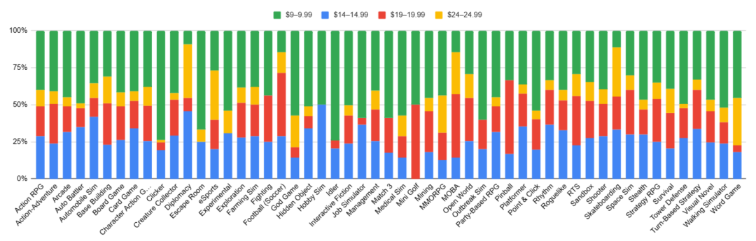 为了选择最合适的定价策略,开发者应当仔细观察同类游戏在不同价位上的表现。不同类型的作品往往会自然聚集在特定价格区间,而这种聚集效应,也会进一步塑造游戏所吸引的受众类型。例如,在19.99美元这个价位上,最常见的类型是动作RPG、探索类以及动作冒险类。