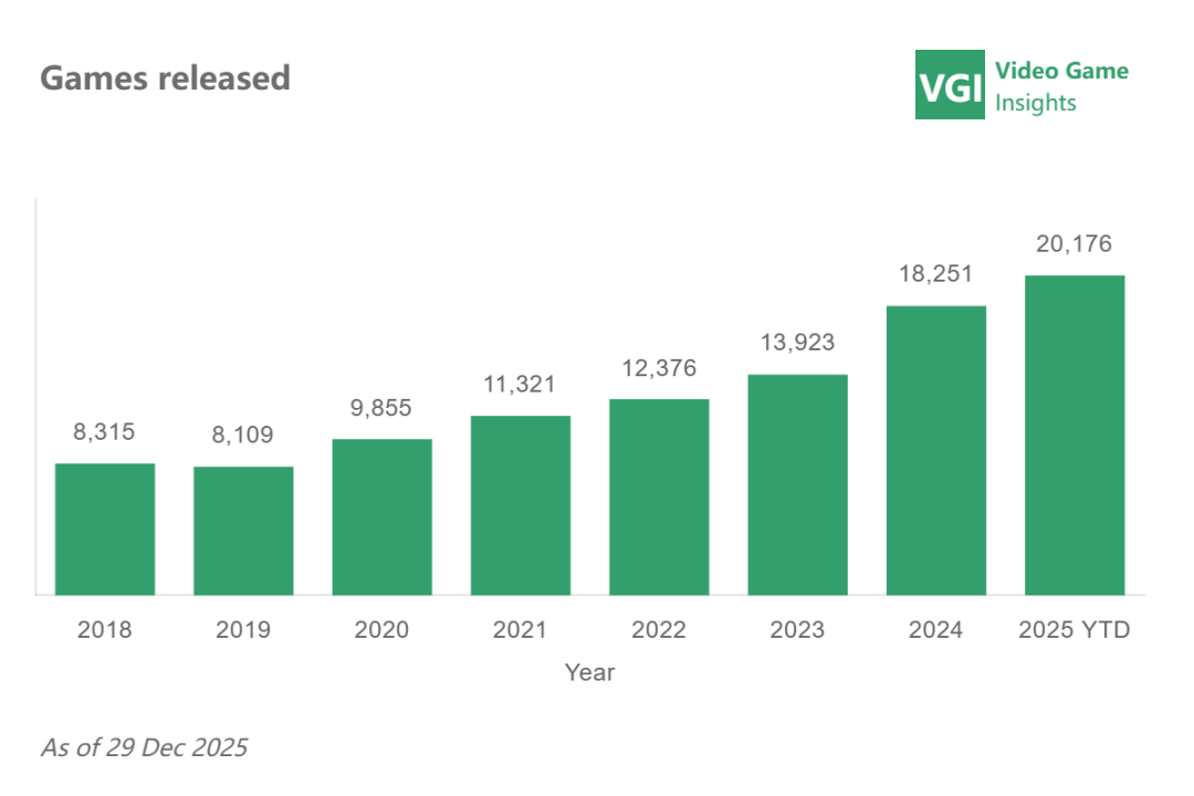 尽管上述许多作品都是多平台发行,但需要特别说明的是:本次研究将聚焦Steam平台。这是目前增长速度最快、内容体量和竞争强度都创下新高的平台之一。数据显示,2025年前三个季度,Steam新游戏发布数量同比2024年增长了27.8%。