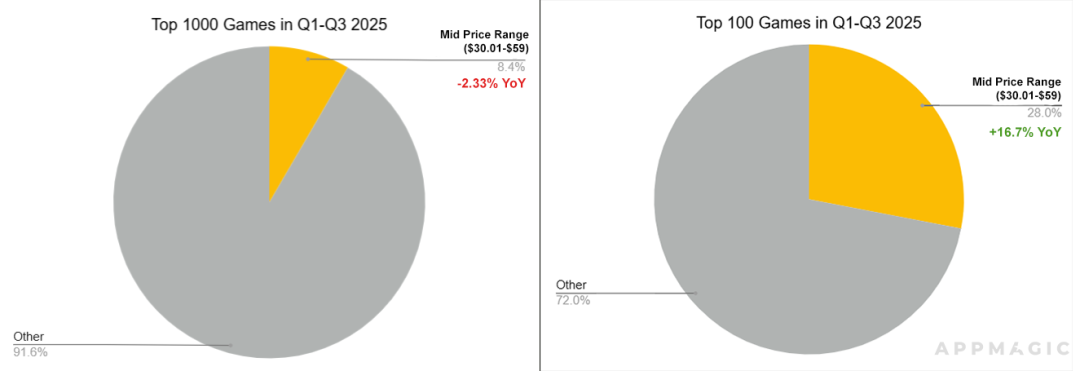 30–59.00美元的价格区间通常与2A游戏相关,因此在此我们为行文方便采用这一称呼。当然,现实中也存在例外——你同样可以在这一档位看到Indie+或3A作品。在2025年Q1–Q3期间,中价位区间在Top 100收入榜中的占比有所增强,同比增长16.7%。但如果放眼Top 1000,情况则略有不同:这一类别同比小幅下降2.3%。