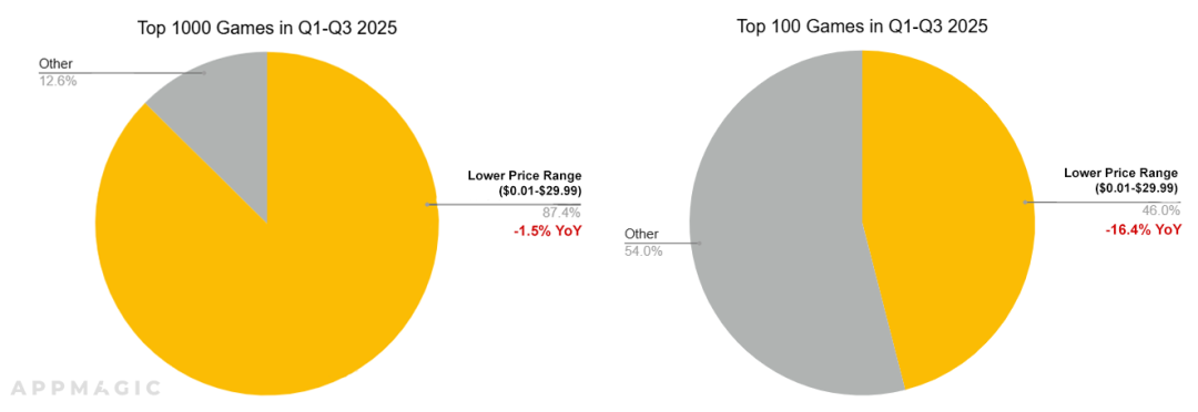 今年,低价位区间依然在Top 100和Top 1000的收入榜单中占据着最多的作品数量。尽管在2025年Q1–Q3期间,该区间在Top 1000中的占比同比小幅下降1.5%,但它仍然覆盖了超过87%的上榜作品。在Top 100中也是类似情况:即便同比下降了16.4%,低价位作品依然占据了46%的席位。