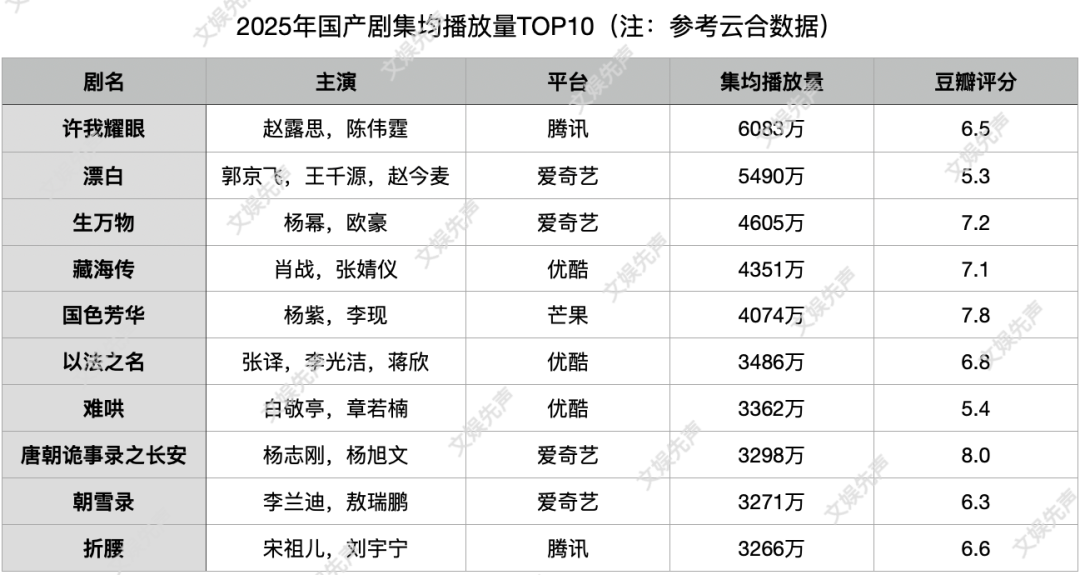 而根据云合数据2025年国产剧集均播放量TOP10(截至12月31日)也能看到,突破8分的仅有《唐朝诡事录之长安》,7分档位剧集也仅有3部。