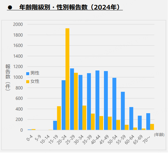 数据显示,日本的男性感染者占比约三分之二,20多岁至60多岁各年龄段均呈上升趋势;女性感染者则高度集中在20多岁。