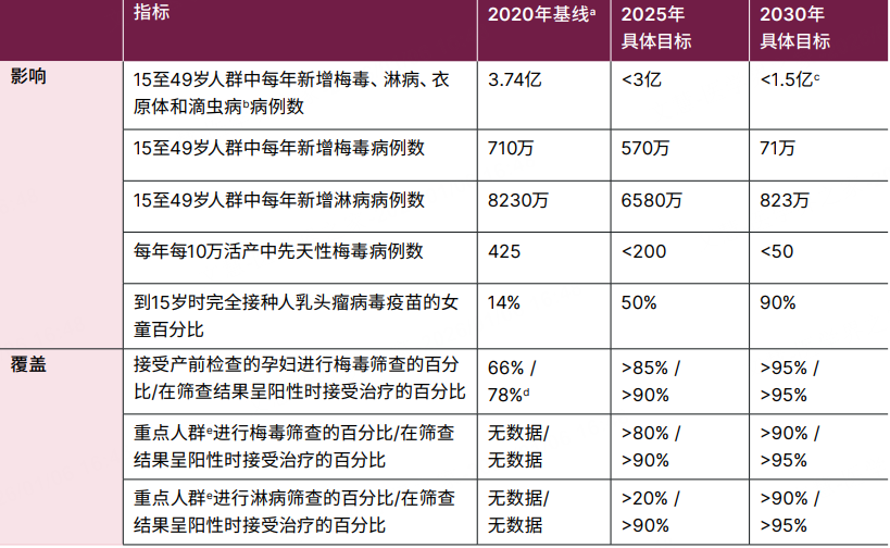 WHO提出的到2030年要实现的性传播感染的影响和覆盖指标、具体目标和阶段性目标