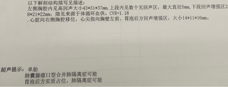 2周后,一大早我们就去超声主任那排队。检查的时候就听到主任说上次的值测算小了,我心里隐隐担心,拿过报告一看,CVR=1.18且肺囊腺瘤合并肺隔离症可能。