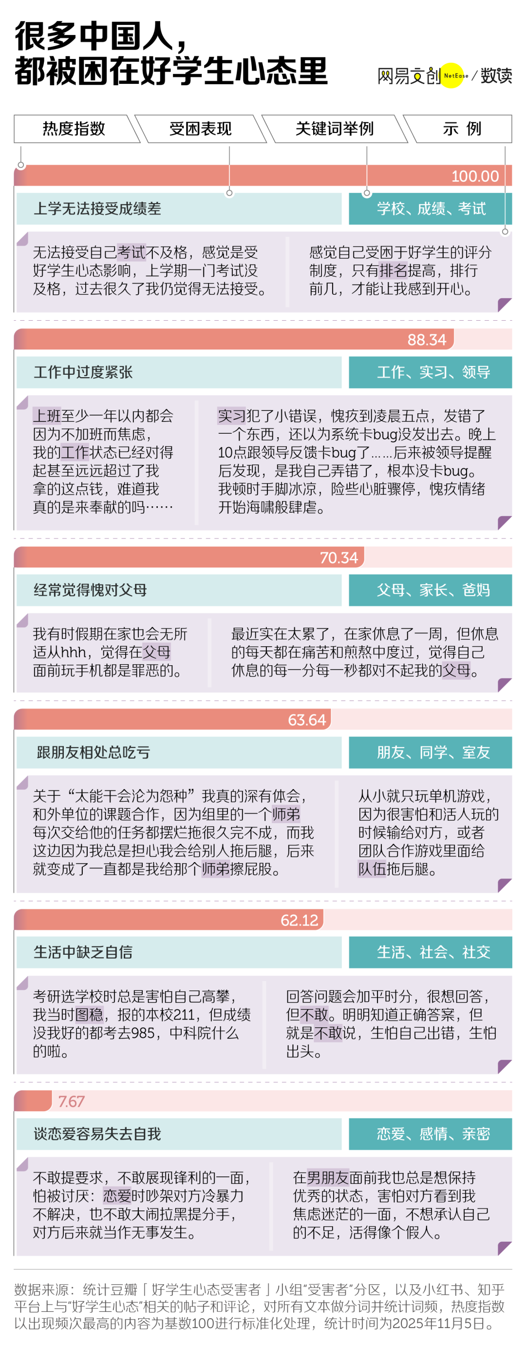 我们统计分析了社交平台上的相关帖子后发现,好学生心态最典型的特征,是对他人评价的过度在意。他们做事的出发点,往往是为了得到周围人的夸奖。同时,对他人流露出的失望,往往难以承受。