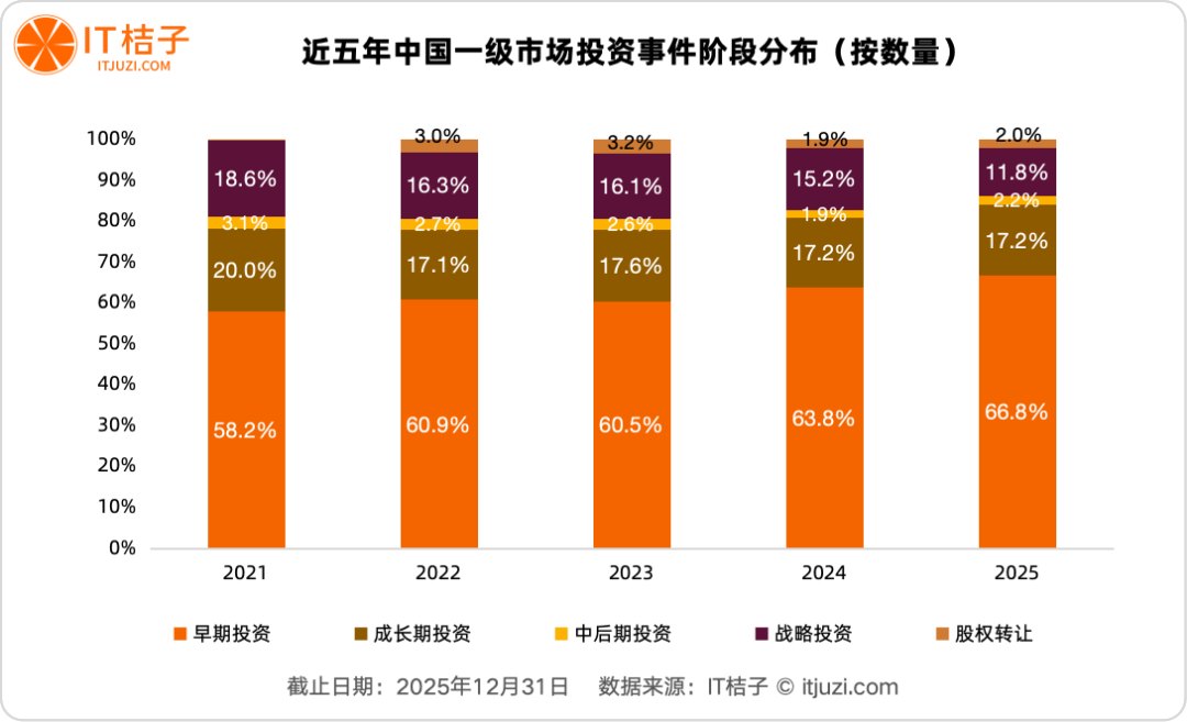 从交易数量看,早期投资(种子、天使、A轮)是市场活力的主要来源。2025年,早期投资事件达6054起,占市场总数的66.8%,创下近五年新高。