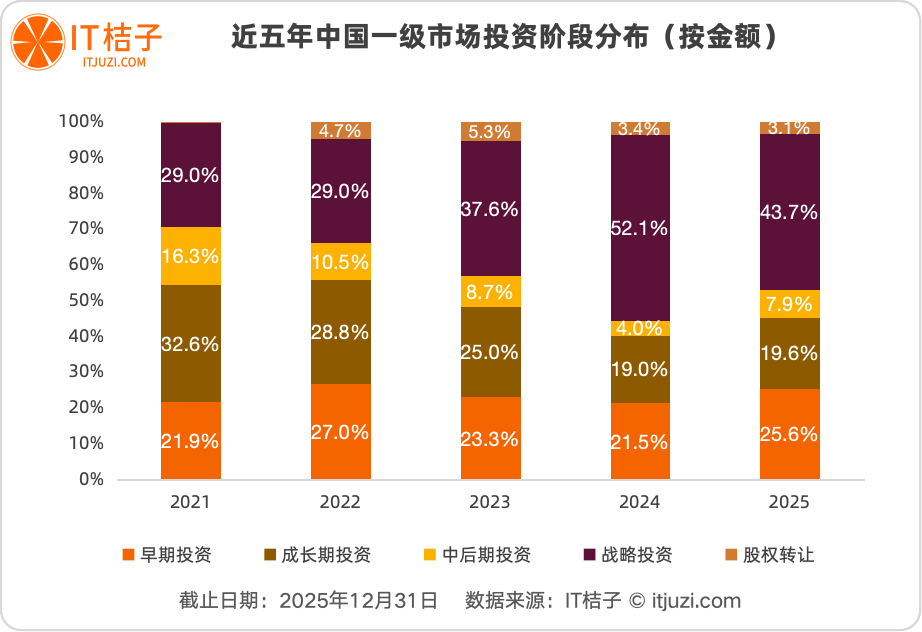 作为连接早期创新与后期整合的关键桥梁,成长期与中后期融资正经历严峻考验。从金额看,成长期投资占比从2021年的32.6%断崖式下滑至2025年的19.6%;中后期投资占比更从16.3%减半至7.9%。