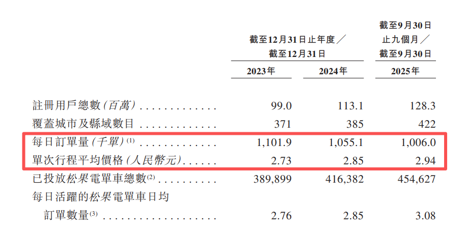 招股书显示,松果出行的每日订单量由2023年的110.19万单减少至2024年的105.51万单,并进一步减少至截至2025年前三季度的100.60万单。松果出行解释称,这主要归因于对经营区域组合的战略优化,将运营调整至大规模市场。此战略优化仍在进行中。