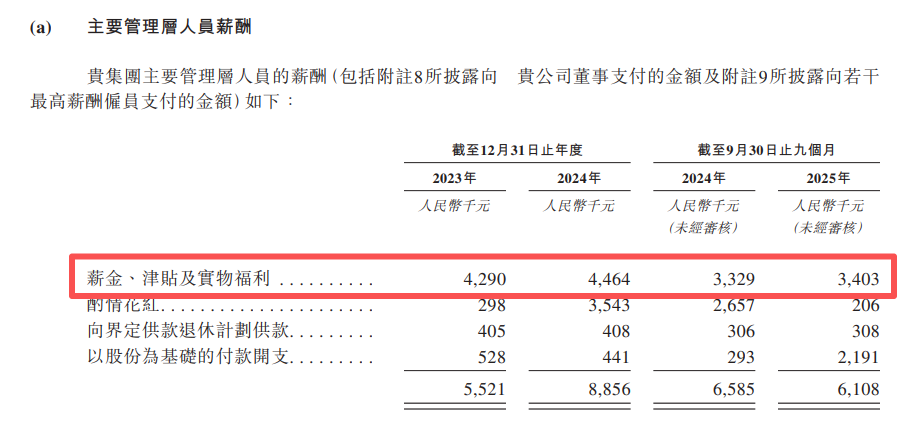 作为对比的是,主要管理层人员薪金却逐渐上涨,2023年、2024年、2024年前三季度、2025年前三季度,分别为429万元、446.4万元、332.9万元、340.3万元。