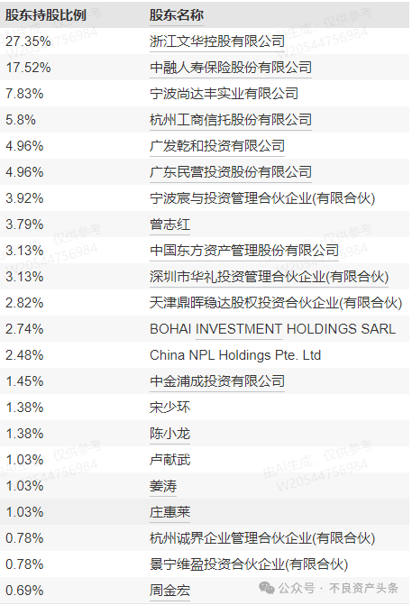 2004年,创始人周智杰抓住不良资产投资的第一波机会,成立浙江文华,开始涉足不良资产行业,2006年,又成立了文盛资产,其高管背景多元化,交易所、法院、警察、律师等等。