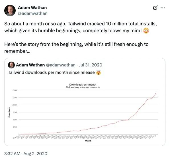 2020年7月,Adam Wathan还在公开回顾Tailwind的“上升期叙事”:Tailwind的累计安装量刚刚突破1000万,而他们的首个商业化产品Tailwind UI上线仅约5个月,收入就即将跨过200万美元。他把这段经历形容为“完全超出想象”,并特意把最初发布在Twitter的长帖重新整理成文章。