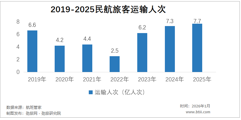 来自航班管家的统计显示,2025年我国民航完成旅客运输7.7亿人次,同比2024年增长5.5%,同比2019年增长16.7%,旅客运输创历年新高。