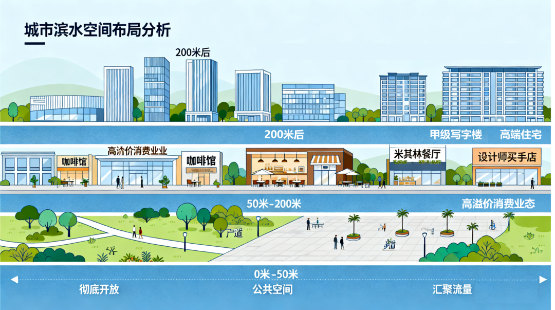 紧邻步道的是密集的咖啡馆、餐厅与高端零售,它们以绝佳视野为卖点,消费溢价显著,直接捕获水景价值。