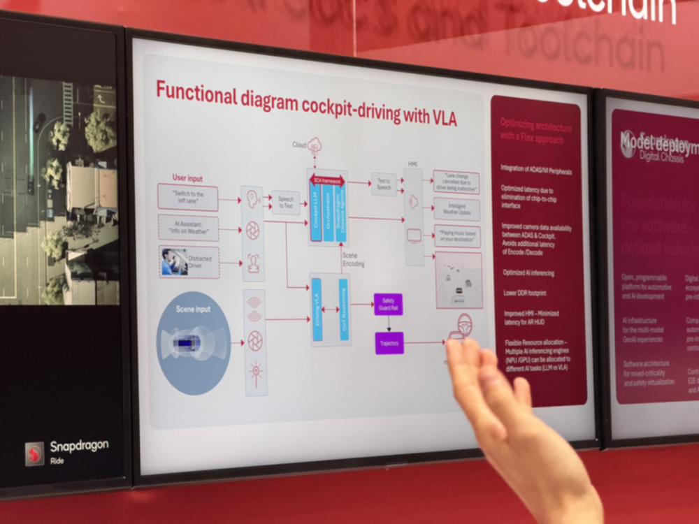 高通在CES上直接另辟一个单独的展区来介绍跟汽车有关的技术。从底盘、座舱到辅助驾驶都有涵盖。展示的Snapdragon数字底盘方案,核心不再是性能参数,而是舱驾一体的硬件思路。通过在单一SoC上同时处理座舱与辅助驾驶任务,系统可以减少数据割裂,让不同域之间的信息协同变得更自然。这种架构,对成本控制和规模化落地尤为重要,也更适合中端和主流车型。