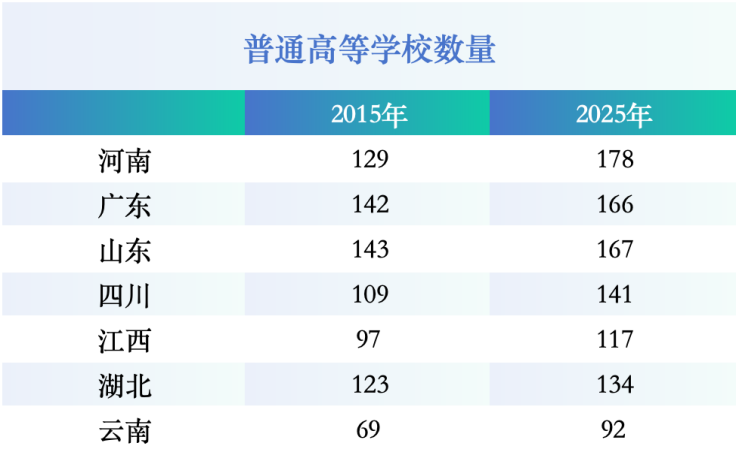 根据教育部数据,2015年至2025年,人口大省的高校数量显著增加: