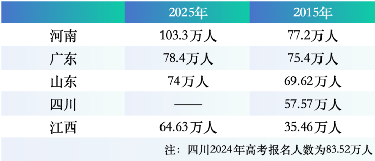以河南为例,2025年高考报名人数103.3万人,为全国之最,但同期其本科录取率约35.4%至37.72%。