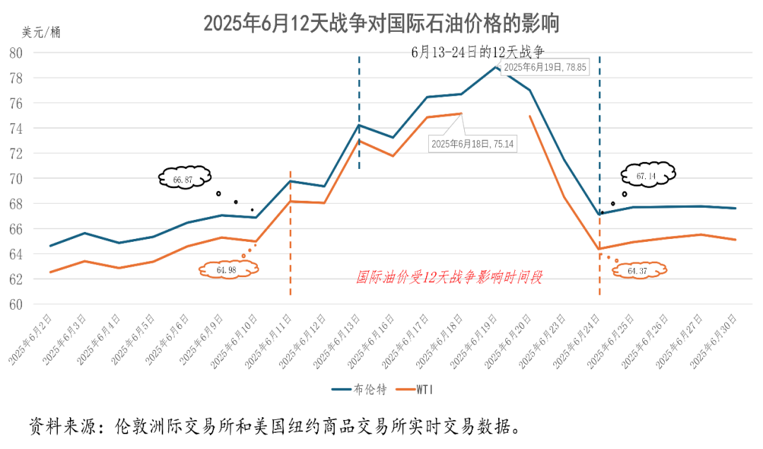 对2025年国际石油市场冲击最大的突发事件,是6月13日至24日爆发的以色列-伊朗-美国“12天战争”。以色列、美国轰炸伊朗的核设施,在中东问题和国际问题研究中都被假设为末日事件,但在2025年6月中下旬的短短12天里就真实地发生了。与市场普遍担心不同的是,12天战争对国际石油市场的冲击,仅仅只是从6月11日至19日的7个交易日,以布伦特原油为例,其期货价格每桶上涨了11.98美元,涨幅为17.91%。2025年6月21日凌晨,美国轰炸伊朗核设施后,23日国际石油价格即出现回落,24日宣布停战后国际油价基本回落到战争爆发前6月10日的水平,12天战争对国际石油市场的冲击也宣告结束。