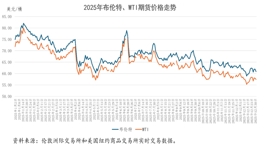 从高低价差看,2025年的国际石油价格出现了非常大的波动。2025年国际石油价格的最高价,出现在1月15日,布伦特原油期货价格收于每桶82.03美元,WTI期货价格收于每桶80.04美元;2025年国际石油价格的最低价,出现在12月16日,布伦特原油和WTI期货价格,分别收于为58.92美元/桶和55.27美元/桶。与1月15日的最高收盘价相比,12月16日的最低收盘价,分别下跌了23.11美元/桶和24.77美元/桶,跌幅高达28.17%、30.94%。