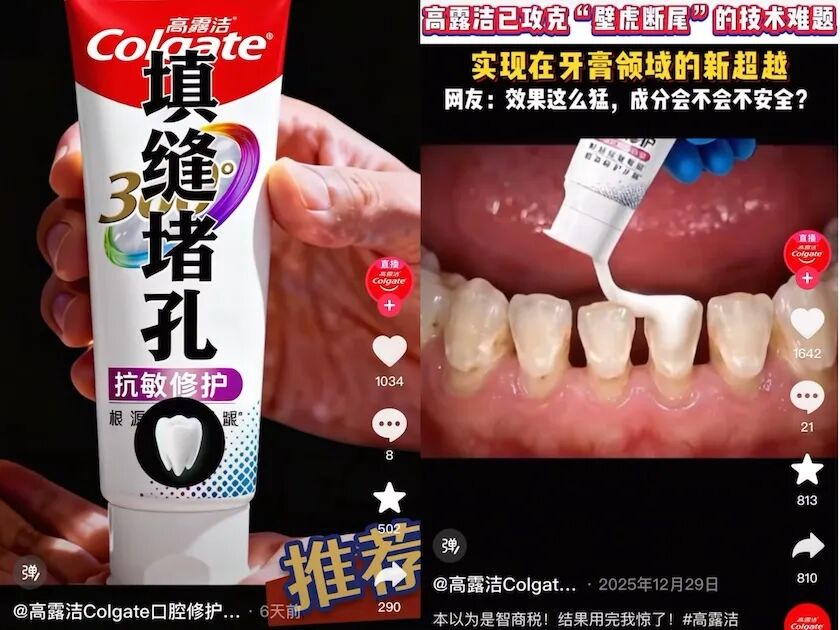 近日,界面新闻在浏览短视频平台时发现,高露洁的“360°抗敏修复牙膏”在短视频平台投放一系列内容,暗示“能让牙缝自己长回来”。“高露洁Colgate口腔修护牙膏直播间”等账号,近期曾集中发布多条围绕“高露洁360°抗敏修复牙膏”的宣传视频。视频中反复强调产品所含的“促生氟磷灰石”成分,并将其描述为“一种天然生物胶水”。