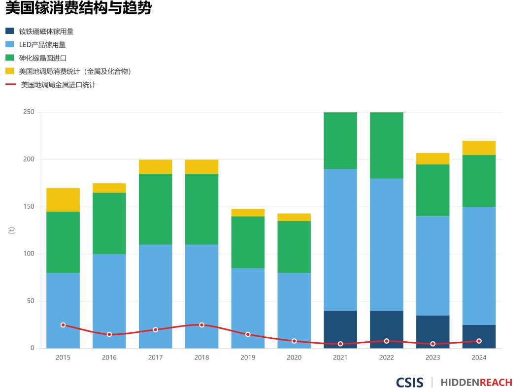 镓广泛应用于各种技术领域,涵盖先进半导体、发光二极管、激光二极管和永磁体等尖端技术领域。然而,简报指出,官方统计数据却大大低估了镓对美国的真正价值。美国地质调查局公布的数据显示,美国镓年消费量仅为20吨左右。但若将镓基晶圆、磁体和LED进口量计算在内,实际消费量恐高达每年200吨。