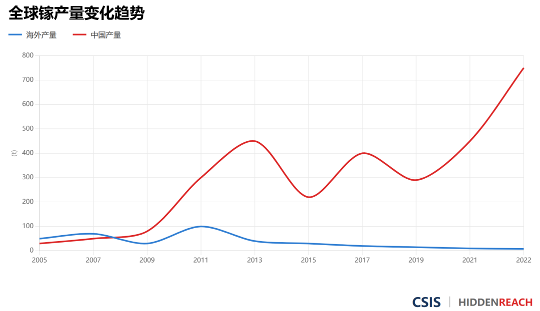 过去二十年间,中国一跃成为全球铝业巨擘,同时锻造出大规模镓生产的技术能力与产业基础。在政府鼓励下,中铝集团等国有铝业龙头企业积极部署相关设备,从铝工业尾料中回收提炼镓元素。2010年前后,中国低纯度镓产量开始井喷式增长,大量产品涌入国际市场。在此后十年间,大部分非中国供应商相继退出市场。