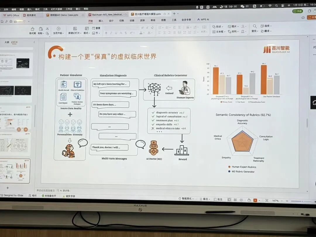 所以到了M3,我们最重要的升级就是把右侧的“考官”也变成了动态的。也就是说,当你的AI模型能力变强了,教你的这个“考官”也会跟着变强,它会从更困难、更细粒度的医学思维原则上去指出你的不足。这样一来,M3就能在强化学习的过程中持续变强。这就是从“半动态反馈”到“全动态反馈”的演进。