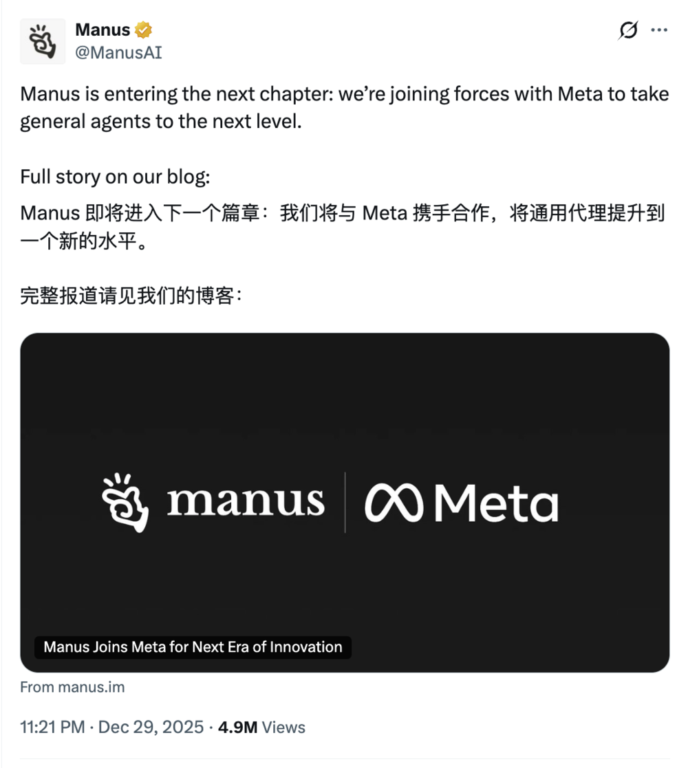 12月,Meta宣布收购Manus,至此,从产品层面,Manus成为了一个标志,一个中国团队做出AI应用层世界级的产品,给后来者极大鼓舞。