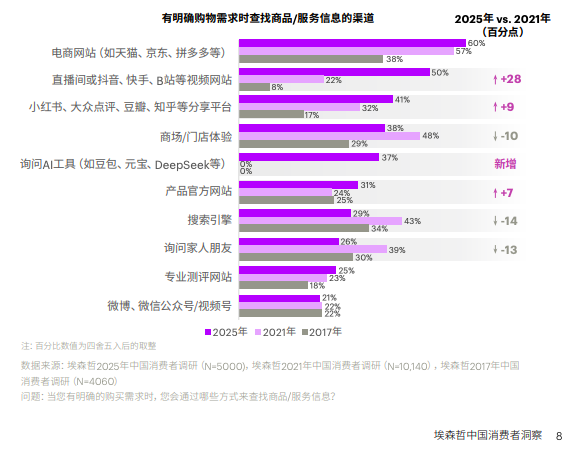 线上购物的占比势不可挡。《数字消费发展报告(2025)》显示,2025年上半年,基于商品、服务和内容的数字消费规模达9.37万亿元,占居民消费支出总额的46.5%。埃森哲的报告同样显示,2025年电商网站仍是消费者获取购物信息的主力渠道(60%),其中直播间和视频平台位列第二(50%)。对于很多门店、品牌来说依靠单向输出的营销模式正在失效,对品牌营销策略提出了新挑战。但线上购物比例的提升,也为品牌和门店突破地区限制、拓展消费客群提供了机会。