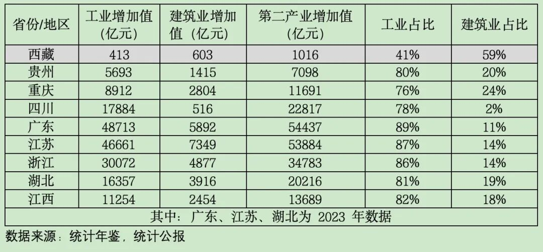 长期以来,在第二产业中,西藏是西部乃至全国唯一一个工业增加值比重低于建筑业比重的地区,也是全国唯一一个工业增加值占第二产业的比重不足50%的地区。西部各省除西藏外,工业增加值比重都在80%左右,与东、中部各省的差距较小,但西藏的工业增加值比重则不到东部省份的1/2。