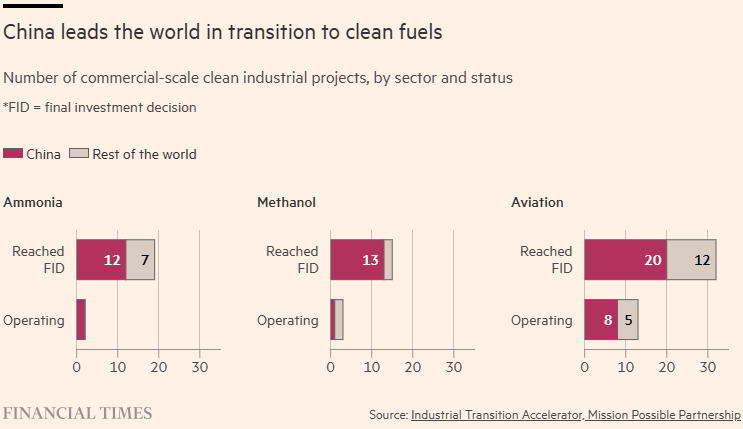 这对于在下一波清洁燃料技术的规模化商业化方面处于领先地位的中国而言,并不是好消息。据国际非营利组织“可行使命伙伴关系”(Mission Possible Partnership)的数据,中国已投运或已获融资的商业化清洁燃料产业项目已达54个,这一数量是美国的三倍。