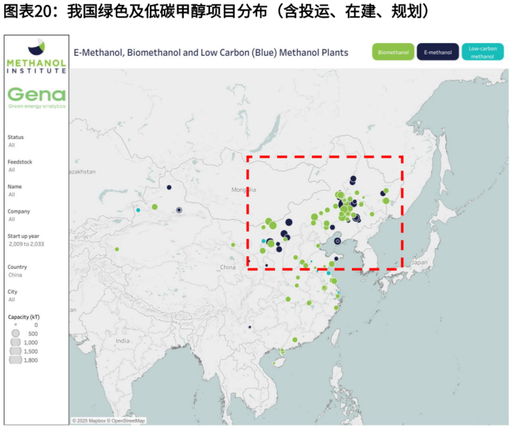 图说:我国绿色及低碳甲醇项目分布(含投运、在建、规划)