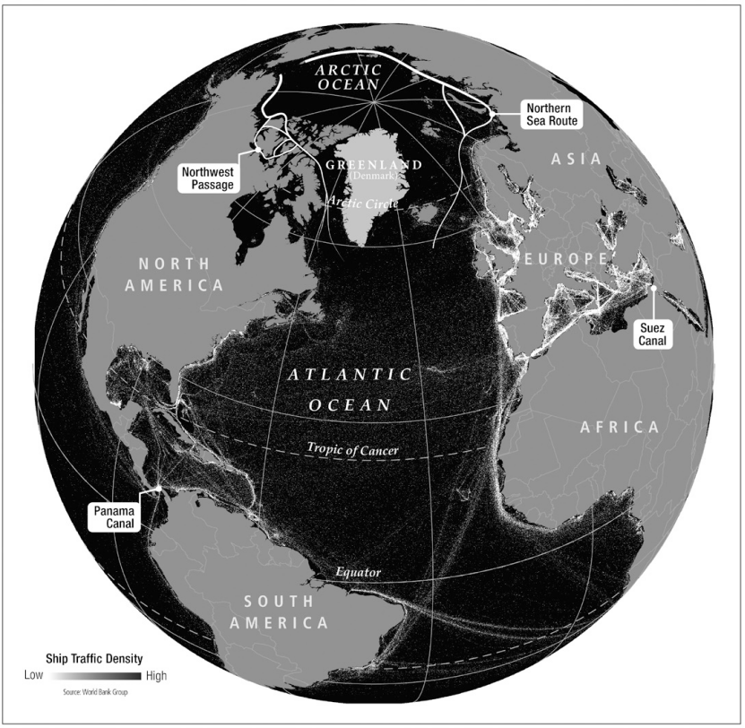 跨北极航运的潜力:格陵兰的地理位置还使其处于一个重要的“瓶颈”位置:沿北美北部海岸线的西北航道和穿越北冰洋中心的跨极海航线,随着北极海冰融化,这些航线可以缩短航运时间,绕过苏伊士运河和巴拿马运河等传统咽喉要道,可以在一定程度上控制欧洲与亚洲之间的货物流通——尤其是随着北极航道的开放和全球运输线路北移,这一点愈发显得重要。