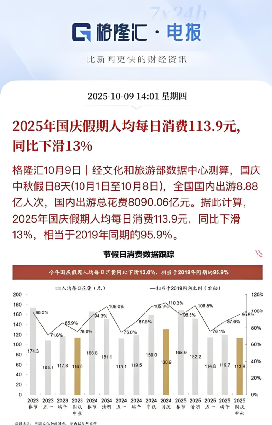 据文化和旅游部数据中心,2025年国庆假期,国内出游人次达8.88亿,但旅游收入折算日均人均消费113.88元,较2024年下降了12.9%。“出来玩的人更多,但花得更少了”成为假日经济的新常态。
