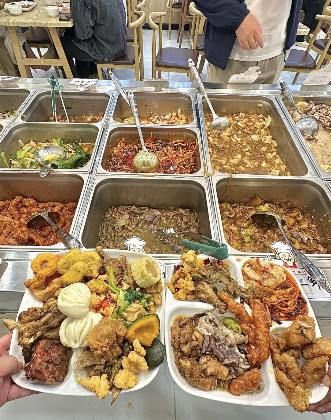 一溜儿不锈钢大盆,里面堆成小山的锅包肉、红烧肉、地三鲜;人人端个比脸还大的盘子,在饭菜蒸汽里穿梭,脸上就写着四个字——“这波不亏”。