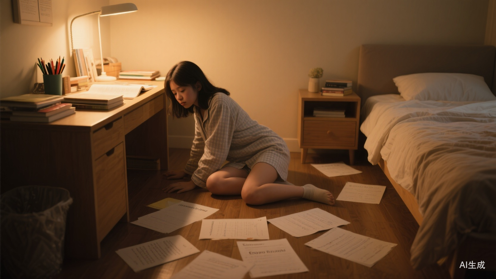 当时,地板上铺满了一些英语作业,垃圾桶里是空空的药瓶。