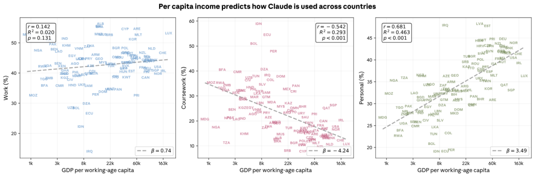 但在人均 GDP 较低的国家,Claude 最主要的角色是“老师”,大量的用途集中在课程作业和教育辅导上。