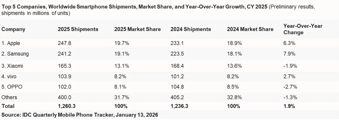 2025年全球前五大手机厂商出货量及市场份额情况。图源 / IDC