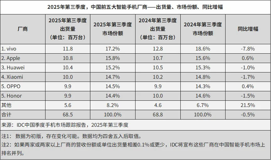 IDC的数据最能说明问题:2025年,vivo全年出货量同比跌了6.6%,是前五名里跌得最狠的;小米虽然全年微增4.3%,但第四季度直接暴跌18%,比华为跌幅还大;OPPO全年微增2.1%,变化不大。