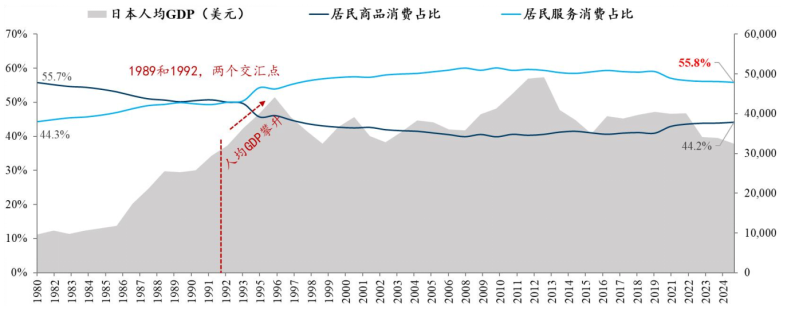 日本的转型始于90年代,1989年服务消费占比首次与商品消费持平,即便经历"失去的二十年",家庭服务消费支出仍稳步增长,2024年服务消费支出已达商品消费的1.4倍,占比高达56%。