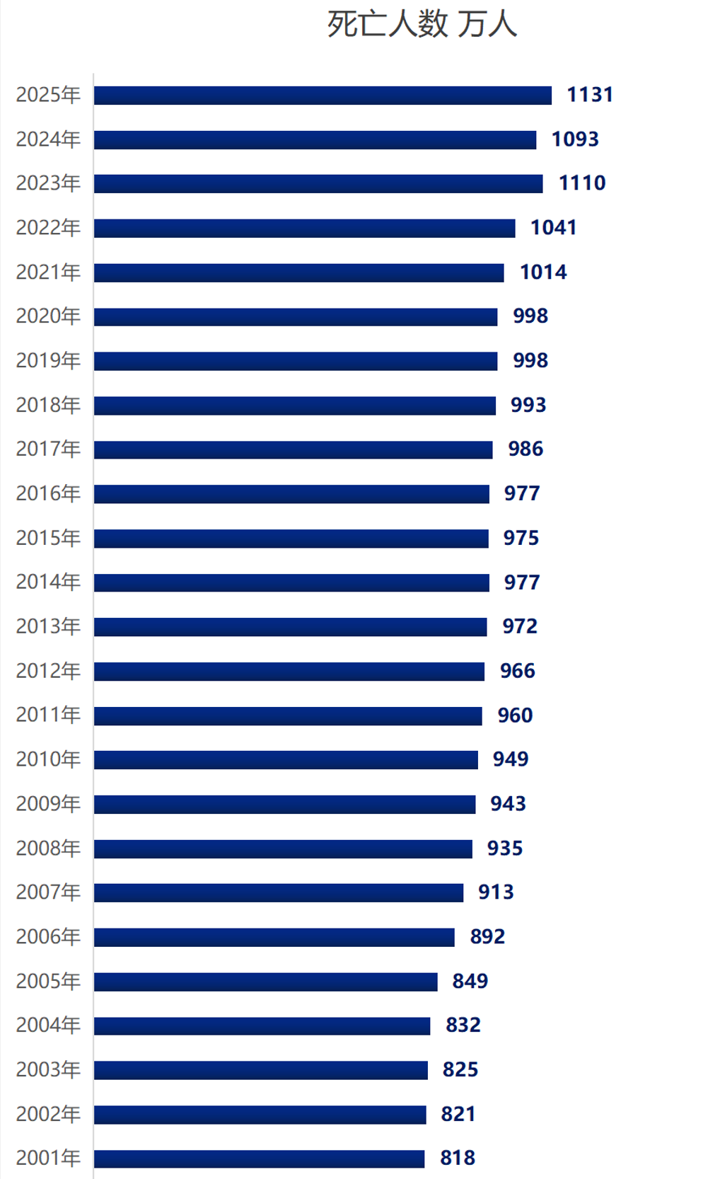 数据显示,2025年全国死亡人口1131万人。这是自2021年死亡人口首次破千万后,第五年维持在1000万以上。