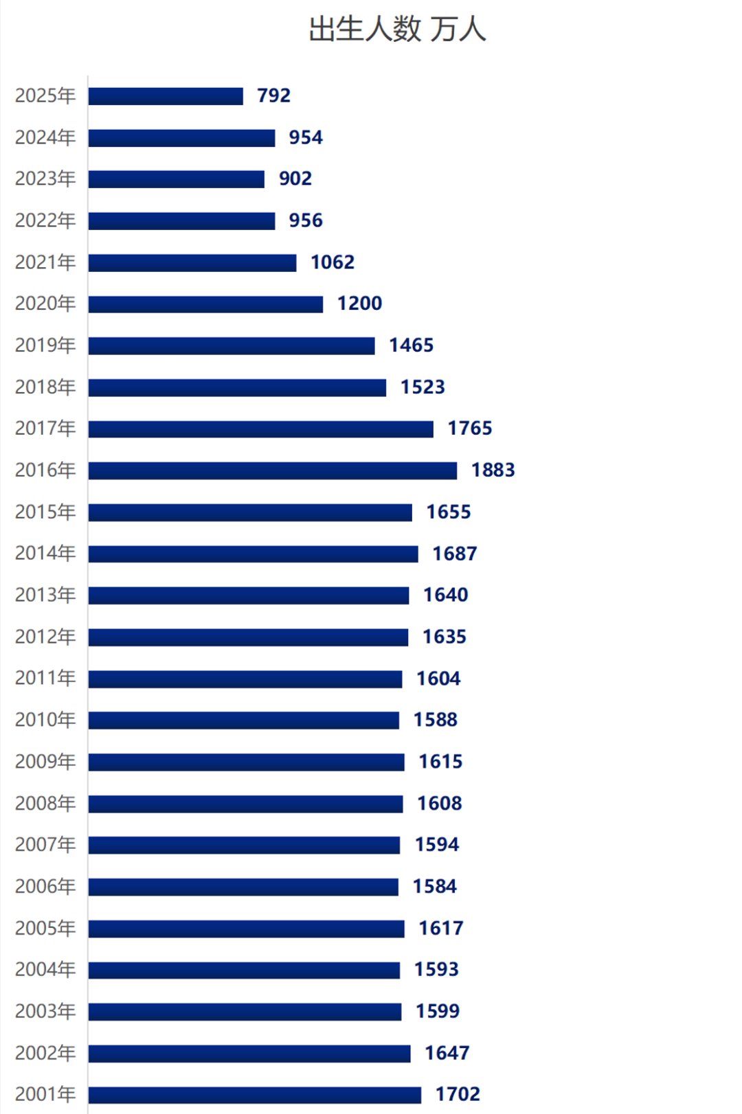 但这一势头未能延续,2025年出生人口就直接跳过800万阶段,滑落至792万,较上年减少了162万。