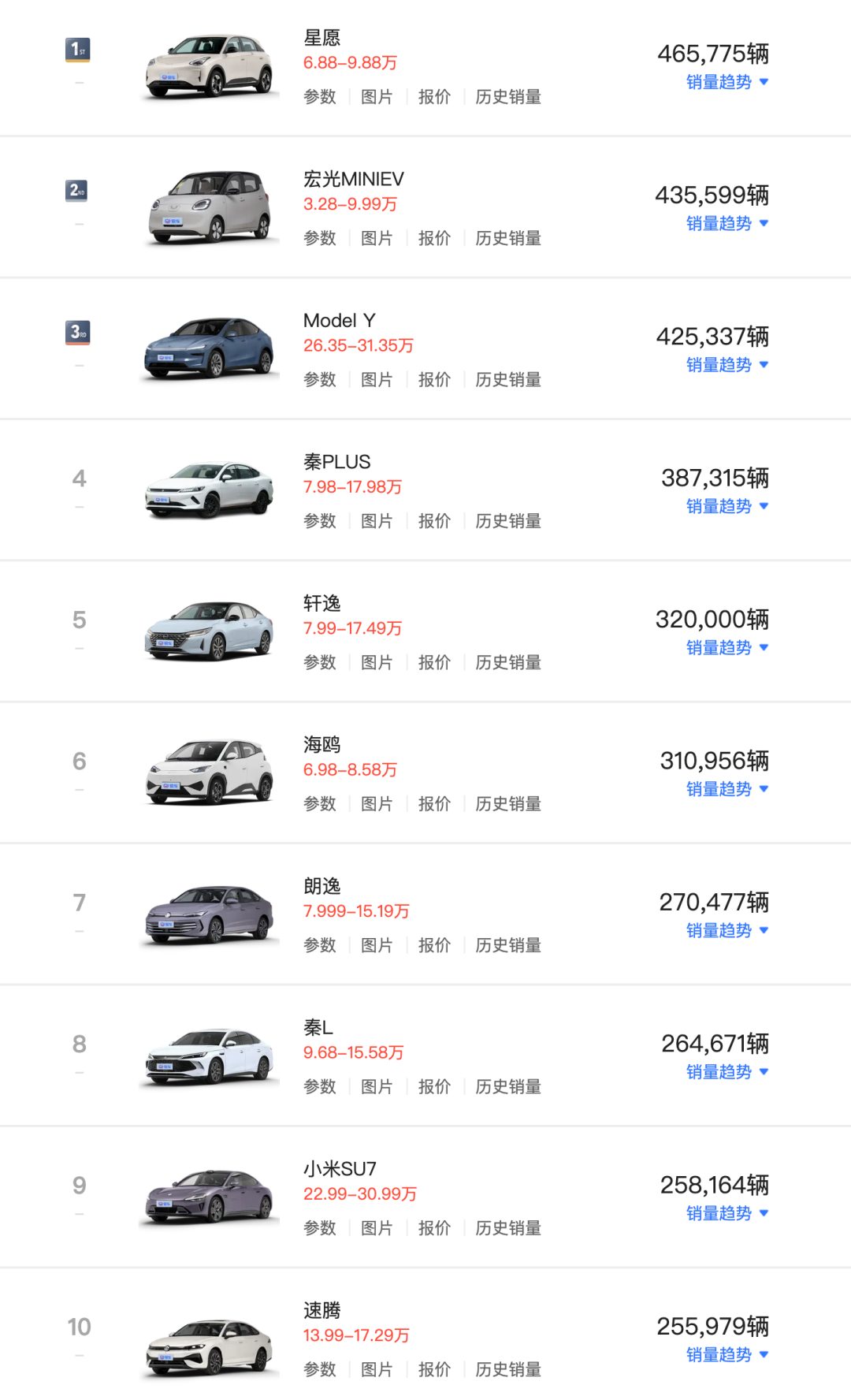 中国2025卖得最好的乘用车前十,中国新能源车占据了六席,冠军为吉利星愿。