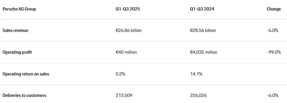 2025年前三季度财报显示,保时捷销售收入为268.6亿欧元,同比下降6%;营业利润仅为4000万欧元,而2024年同期为40.35亿欧元,同比暴跌了99%。